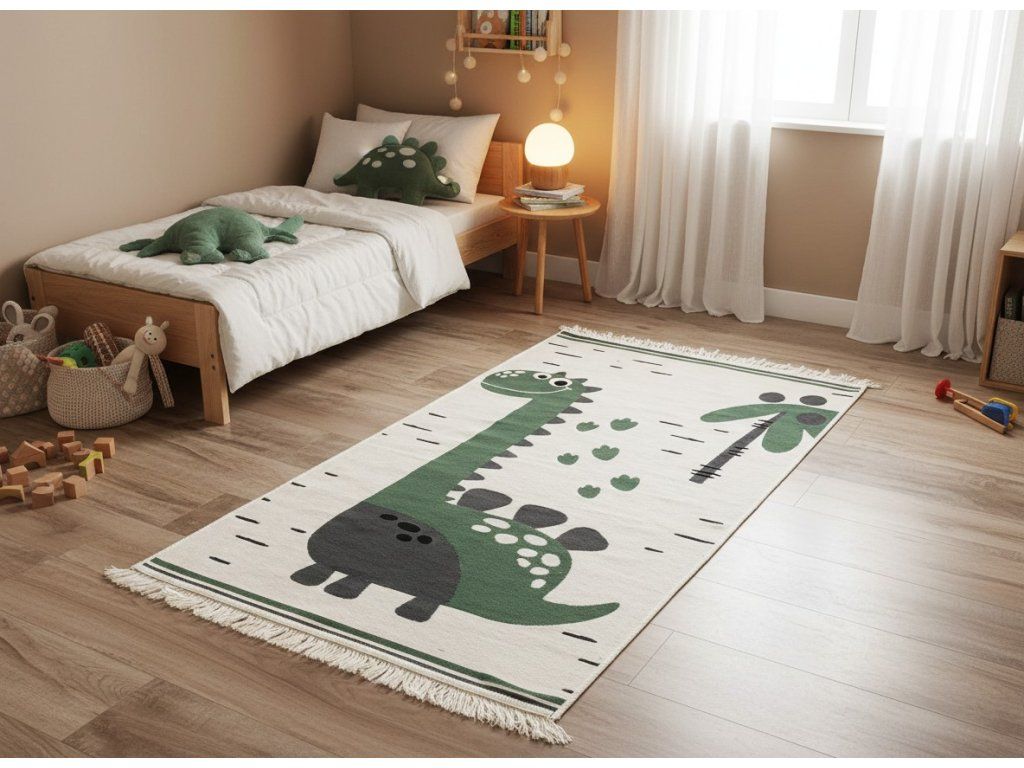 Vysoce kvalitní výrobek kusový koberec Dinosaurus je vyrobený ze 75% recyklované bavlny a 25% polyesteru. Svým specifickým složením se řadí tento výrobek do tzv. ECO produktů. Výroba těchto produktů má Certifikát Global recykled standart.